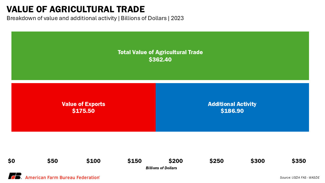 Agricultural trade is vital to the U.S. economy and to the long-term success of American farms and ranches. It generates billions in economic activity, supports over a million jobs, and helps connect U.S. agriculture to growing global markets.