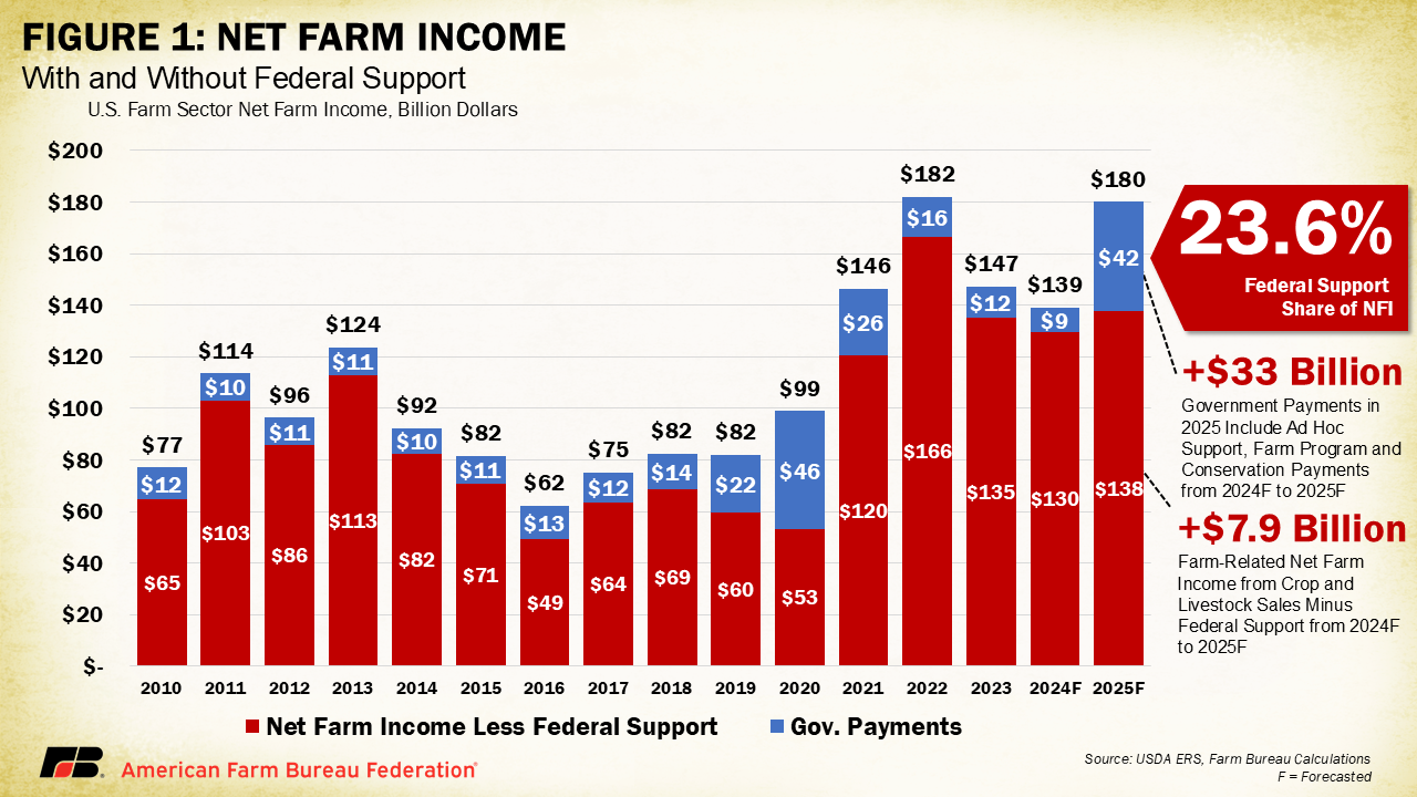 The assistance driving farm income projections up was authorized by Congress to offset financial losses farmers and ranchers endured in previous years. However, many producers are still waiting for details on when and how these funds will be distributed, creating additional financial uncertainty as unpaid bills from 2024 continue to pile up. As a result, viewing the 2025 forecast in isolation misrepresents the true health of the farm economy, which will remain challenged in 2025 by generally low commodity prices and widely uncertain market conditions, including the potential fallout from new trade policies such as tariffs that could disrupt key agricultural export markets and increase input costs for U.S. farmers.