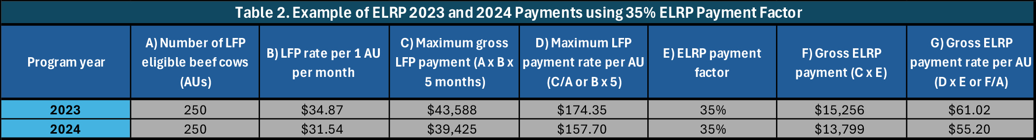 To help producers better understand how these numbers translate to real-world operations, USDA also included Table 2, which walks through a sample scenario. In this example, a producer with 250 beef cattle eligible for the maximum five-month LFP payment would have received $43,588 in LFP assistance in 2023. Applying the 35% ELRP factor results in an ELRP payment of $15,256. In 2024, under slightly lower LFP monthly rates, the same operation would receive $39,425 in LFP and an ELRP payment of $13,799. These values correspond closely with the standardized per-AU estimates provided in Table 1 and offer a practical benchmark for producers estimating their own ELRP benefit.