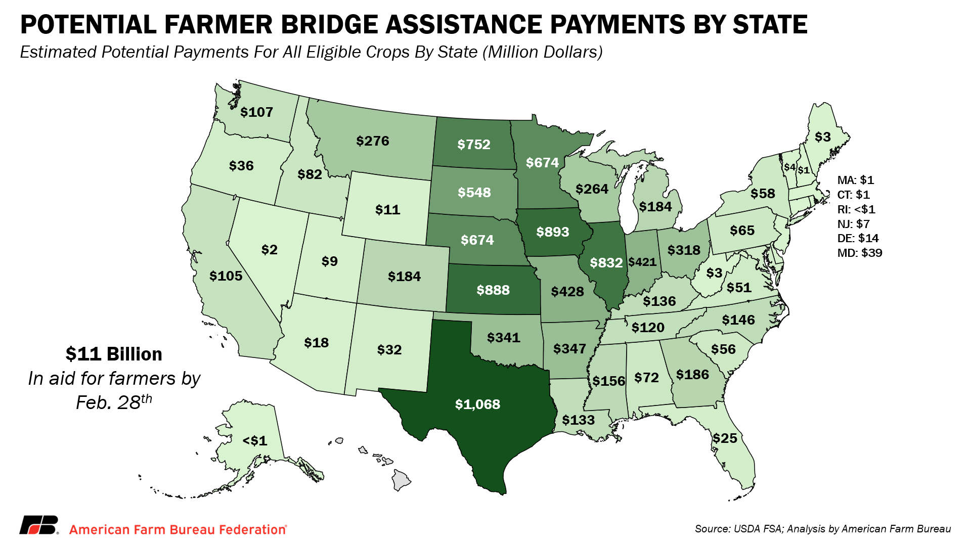 At the state level, FBA Program payments are projected to be highest in Texas at $1.1 billion, followed by Iowa at $893 million, Kansas at $888 million and Illinois at $832 million. Midwest and Corn Belt states in total are expected to receive $6.9 billion (64%), while Southern and Southeast states are expected to receive about $2.8 billion (26%). Western states and states in the Northeast have fewer acres of crops eligible for the FBA Program and, as a result, are expected to receive a smaller share of overall support.