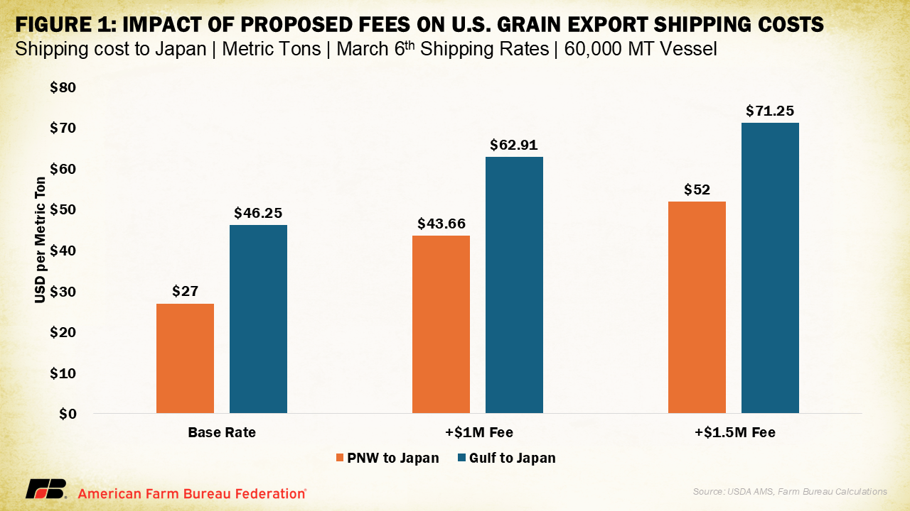 For example, as of March 6,the rate for shipping grain from the U.S. Gulf to Japan was $46.25 per metric ton. From the Pacific Northwest, the rate stood at $27 per metric ton. On a ship holding 60,000 metric tons, a $1 million fee would increase these rates to $62.91 and $43.66 per metric ton, respectively. A $1.5 million fee would push them further, to $71.25 and $52 per metric ton respectively. Such increases will make U.S. products less competitive on the global market and most of this would be passed back to farmers through lower prices or widened basis levels.