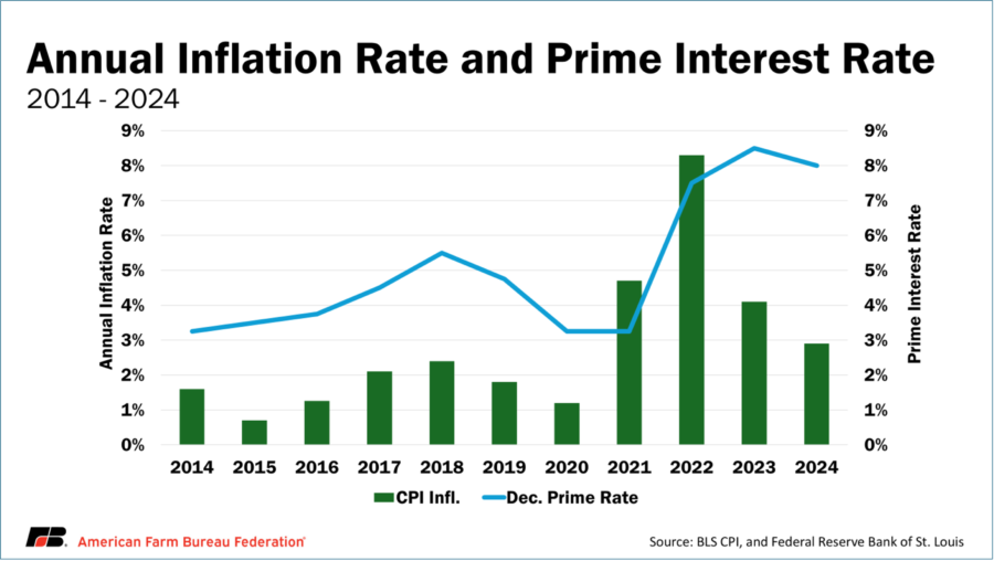 The increases in the EFFR have a substantial influence on the prime interest rate in the U.S. The prime rate is the minimum interest that banks charge their most credit-worthy customers for borrowing money. The current prime rate is 7.5% and was set Dec. 19, 2024. The bottom line is, when the Fed increased rates, they dramatically increased the cost of borrowing money across the economy. This has happened at a time when farmers and ranchers rely more heavily on credit due to the growing gap between commodity prices and input costs.