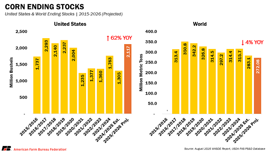Even with higher use, supply growth outpaces demand, pushing ending stocks up to 457 million bushels from last month to 2.1 billion bushels, the highest since 2018/19 and about 60% above the 1.34 billion carried into 2024/25. The season-average price is lowered 30 cents from last month to $3.90 per bushel, reflecting the pressure of a record crop and expectations for relatively low global prices. Following the release of the report today, the December 2025 corn futures contract fell 13 cents to $3.94, which marks the first close below $4 for any 2025 corn contract other than September.