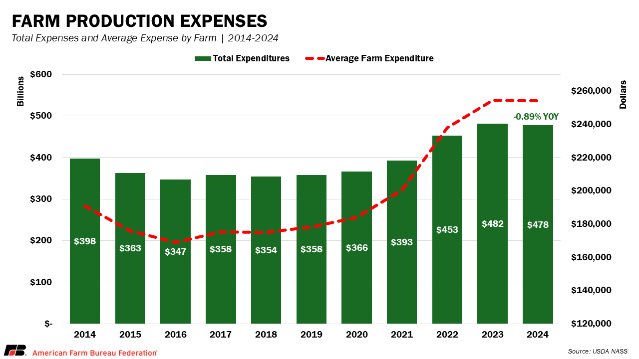 USDA’s Farm Production Expenditures 2024 Summary estimates total U.S. farm production expenses at $477.6 billion, down 0.89% from the record $481.9 billion in 2023. This marks the first year-over-year decline since 2018, though costs remain near 2023’s historic highs and are still more than 30% higher than just five years ago. Regionally, the Midwest had the highest farm expenses at $149.1 billion (31.2% of the national total), followed by the Plains ($111.6 billion, 23.3%), West ($107.5 billion, 22.5%), Atlantic ($58.3 billion,12.2%) and South ($51 billion, 10.7%). California led all states with $48.6 billion in expenses, reflecting the high costs of specialty crop production, including labor-intensive harvests and extensive irrigation infrastructure. Iowa ($35.8 billion), Nebraska ($30.4 billion) and Texas ($26.5 billion) rounded out the top four, each influenced by input-intensive crop and livestock sectors.
